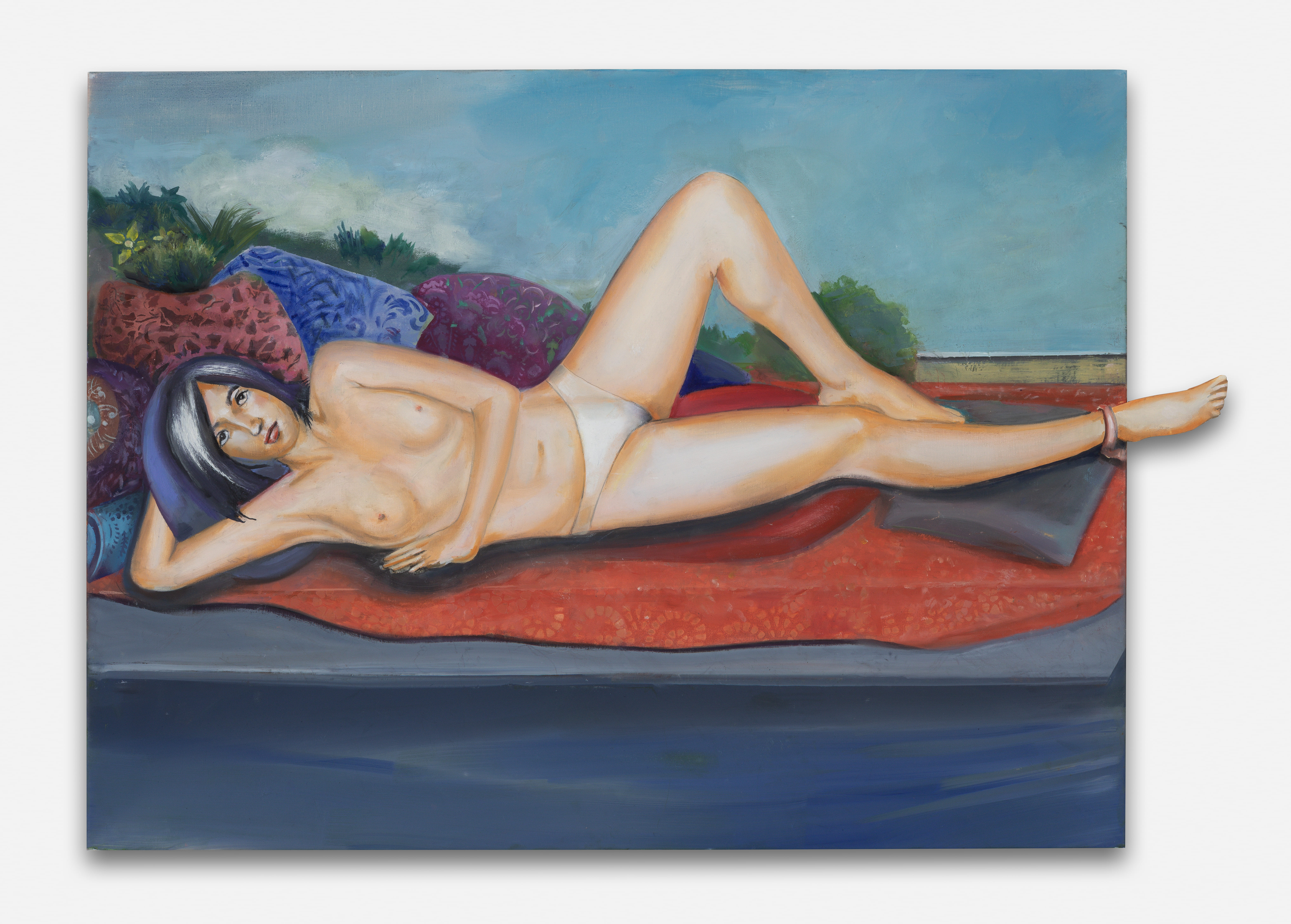 Les renvois à l’histoire de l’art donnent la possibilité de s’engager dans un jeu d’associations tout au long de la visite. Face à Ciel Blue Mili Blue (2014) nous pouvons penser à une multitude d’images d’Odalisques. L’inclusion d’une coccinelle dans Ô Léa ! (2013) peut rappeler la pratique des XVe-XVIe siècles de peindre des mouches en trompe œil comme démonstration de virtuosité technique [2].