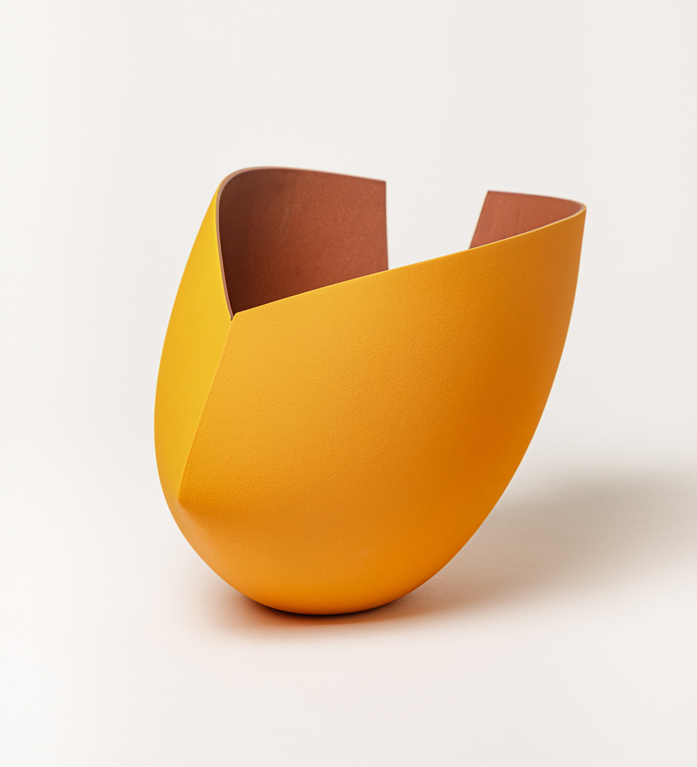 Référence incontournable de l’établissement depuis son accueil en 2017, Ann Van Hoey façonne des objets aux formes évocatrices des origamis. Ceux-ci jouent sur des variations subtiles de formes, de découpes et de dimensions. Caractérisées par leur rigueur géométrique, ses créations présentent une palette limitée à une ou deux couleurs par pièce. Le déploiement d’une bichromie entre les surfaces internes et externes de ses productions permet de d’appuyer leur volume, tout en renforçant leur dynamisme. Pour cette exposition, l’artiste a principalement choisi de montrer ses petits formats afin de rapprocher son travail de celui de son invitée.