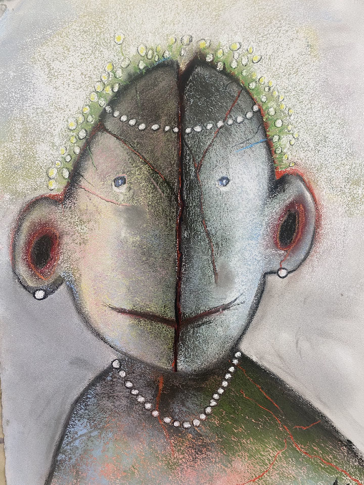 L’exposition à la Galerie GNG célèbre le nouvel élan de son retour à l’atelier. En effet, malgré les inquiétudes exprimées dans la citation ci-dessus, Anouk Grinberg a retrouvé ses encres et ses pastels. En renouant avec son processus créatif basé sur la spontanéité et l’inconscient, elle a créé des images investies de toutes les qualités qu’on prête à son univers. Celles-ci comprennent la puissance émotionnelle de son trait et l’apparition de certains motifs récurrents. Parmi ceux-ci, on peut compter le visage fendu de son Homme content avec bijoux, caractéristique commune à beaucoup de ses figures.