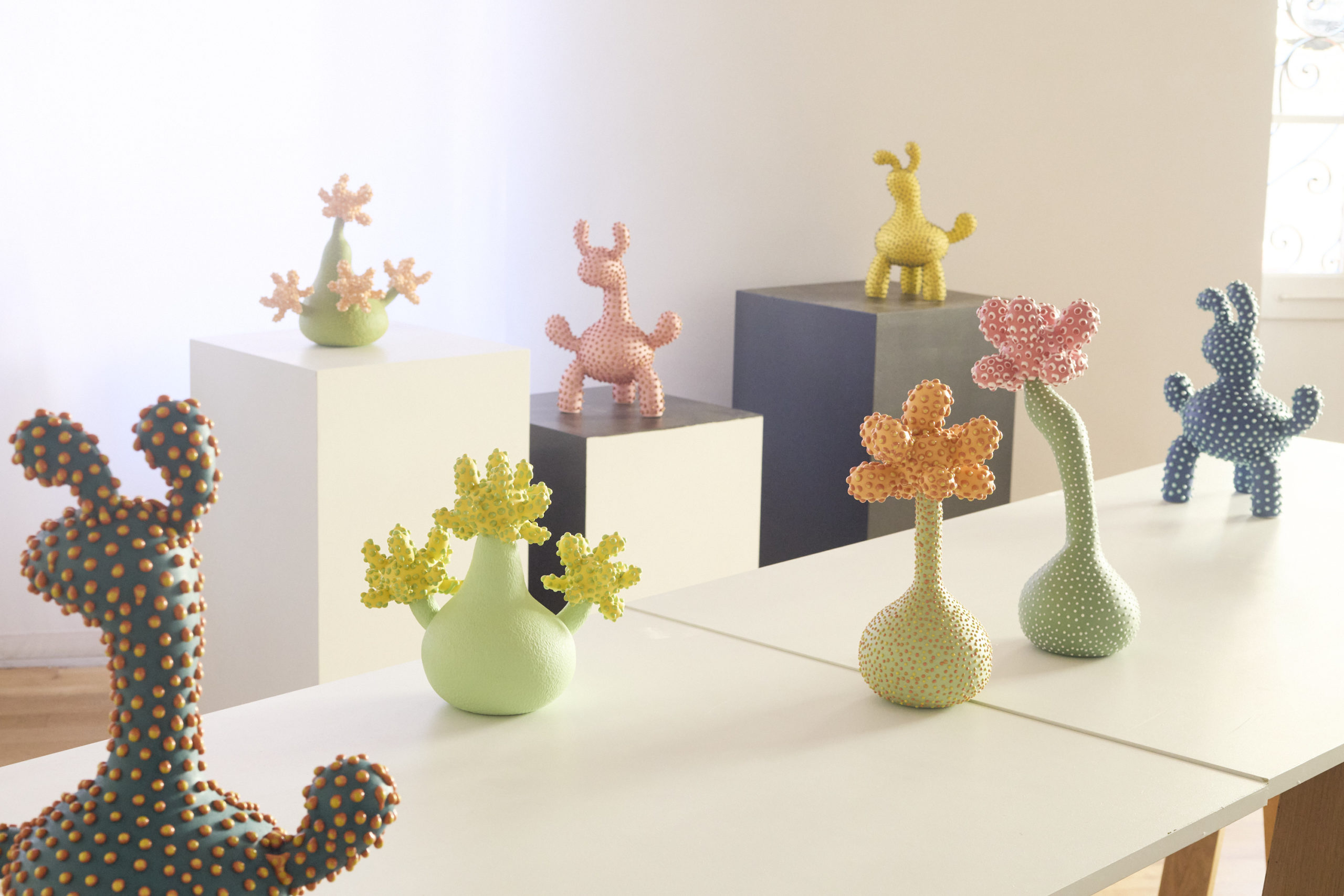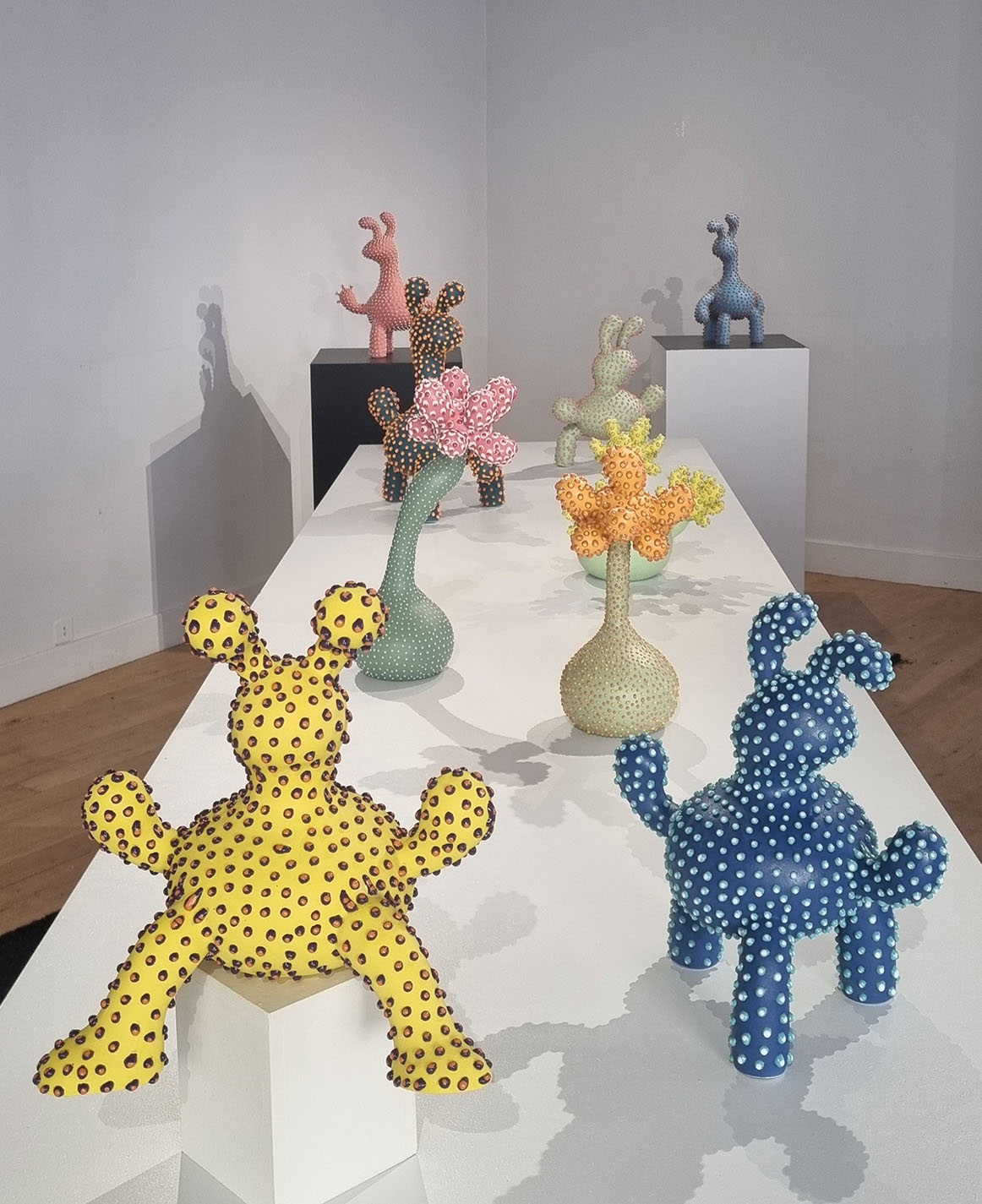 Le titre de l’exposition est représentatif de la place importante accordée à la nature dans l’œuvre d’Ahryun Lee. “Bloominals” est la fusion des mots « Bloom » (fleurir) et « Animals », le terme composé insistant sur le caractère fantastique et hybride de ses créatures. Celles-ci se déclinent en plusieurs versions avec quelques éléments récurrents entre deux types de figures. La céramiste joue sur la sérialité pour proposer un ensemble harmonieux entre des pièces de différentes couleurs.