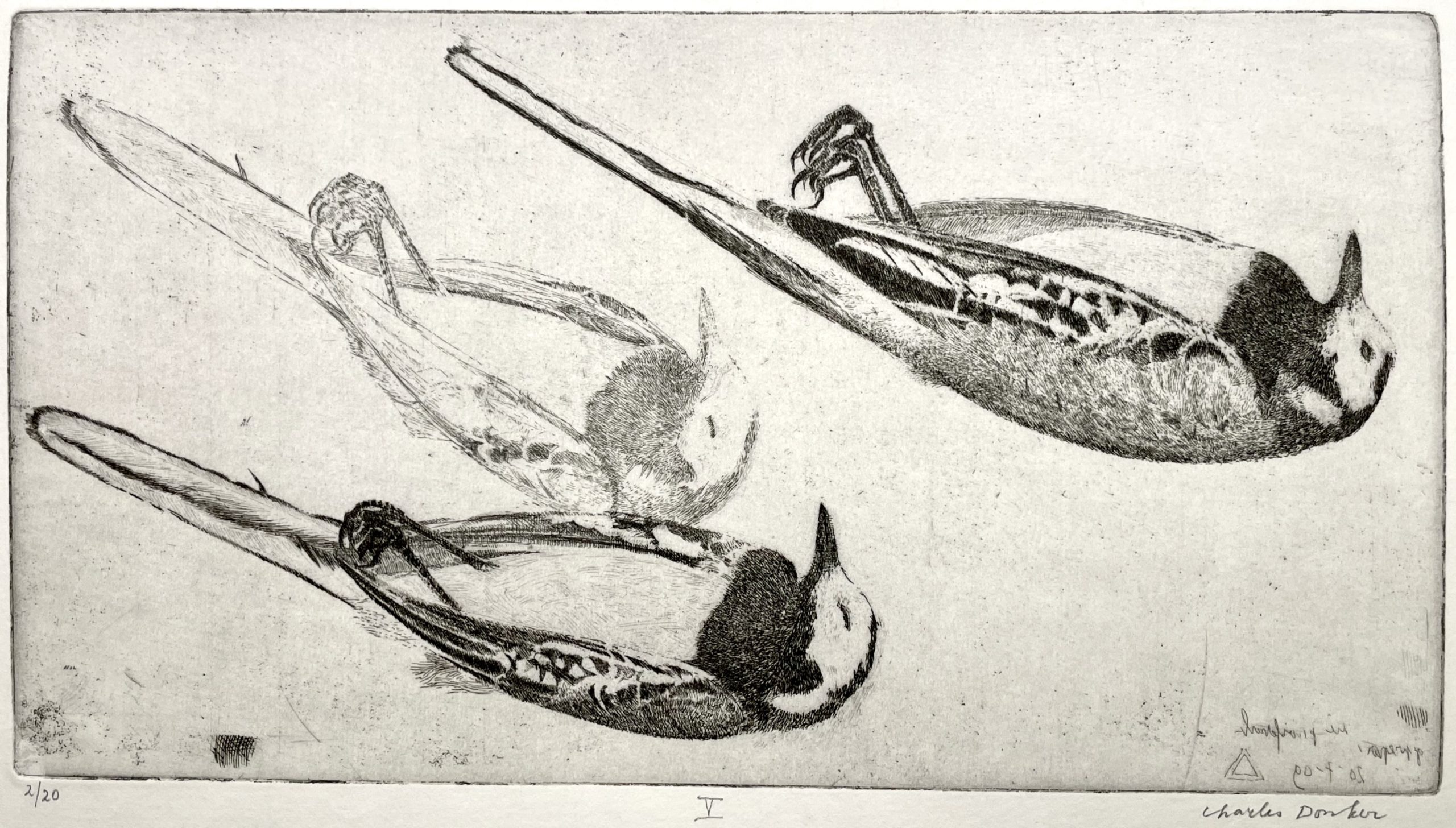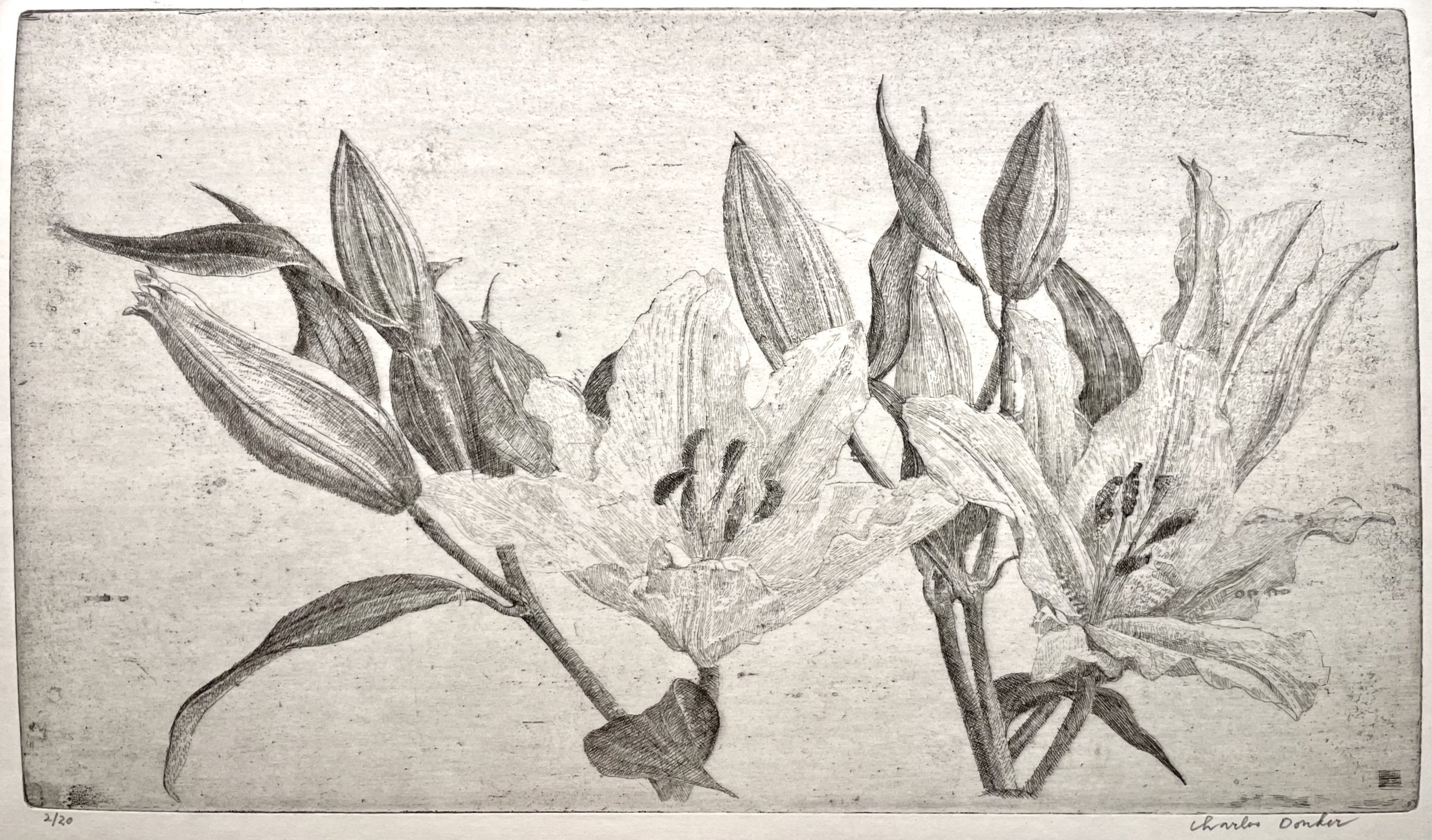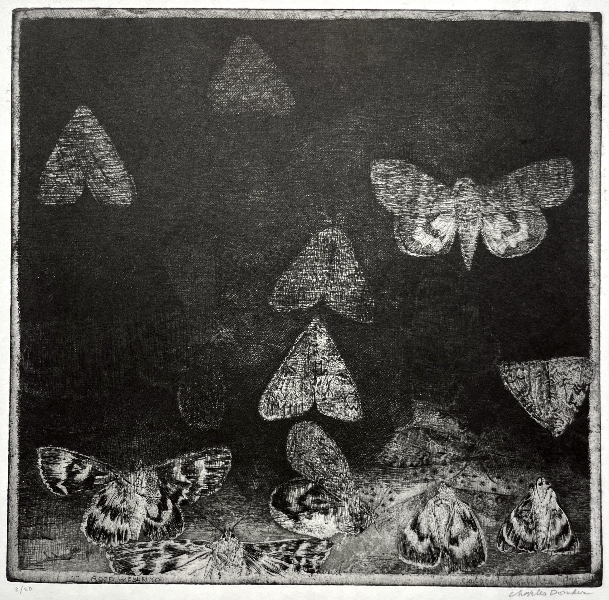 Charles Donker est reconnu pour son art graphique, s’étant exclusivement adonné à la gravure depuis les années 1960. Sa technique de prédilection est l’eau-forte. Celle-ci consiste en une série d’étapes, à commencer par l’application d’une couche de vernis sur une plaque de cuivre ou de laiton. Le graveur va ensuite gratter le vernis pour réaliser son dessin, avant de plonger la future matrice dans un bain d’acide. Le composé chimique va attaquer la surface nue, résultant en une plaque où l’illustration est gravée en creux. À partir de ce moment-là, l’aquafortiste (ou l’imprimeur s’il y a délégation de tâches, en sachant que ce n’est pas le cas ici) peut procéder à l’impression en enduisant le support d’encre pour le presser contre une feuille.