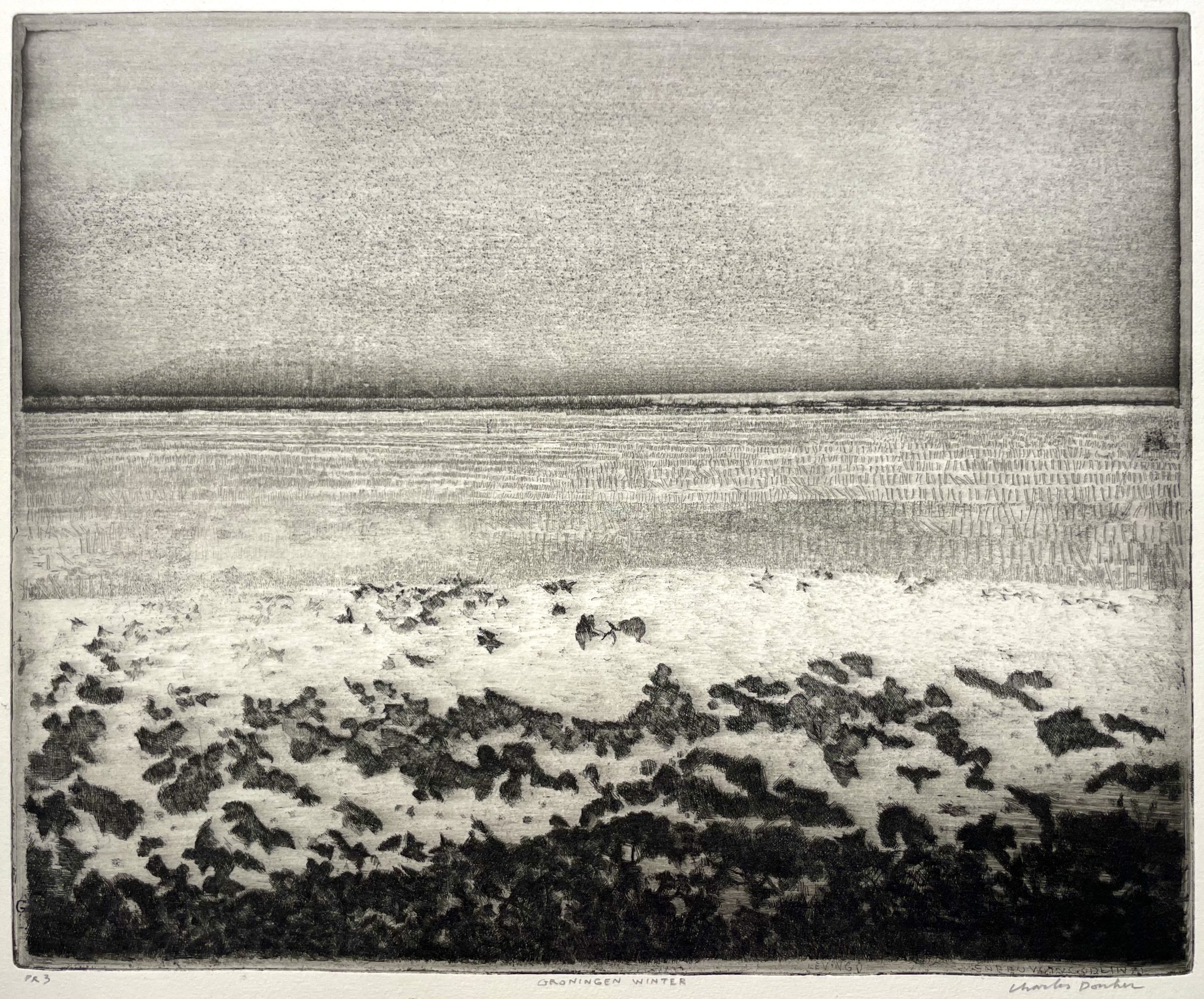 Une des caractéristiques distinctives de la pratique de Charles Donker, est qu’il réalise directement ses motifs sur le laiton verni. Depuis des années, en effet, il ne semble plus baser ses paysages sur des dessins préparatoires, favorisant une réalisation prise sur le vif. La nature représente le thème principal du corpus de l’artiste. La figure humaine s’est rarifiée depuis les années 1970, moment où le graveur délaisse les personnages anthropomorphes en faveur d’éléments naturels, ayant toujours été présents dans son œuvre. [1]