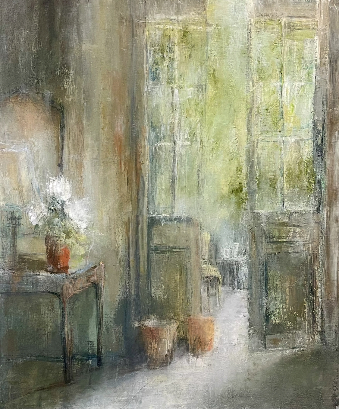 Se décrivant comme une peintre intimiste, Christine Trouillet crée des vues en intérieur dans un style singulier. Elle joue avec la couleur de manière à créer des environnements où les formes apparaissent vacillantes et floues. Cette façon de procéder donne un caractère onirique aux espaces peints, tout en contribuant à leur portée émotionnelle. Ses tableaux, en effet, peuvent susciter une myriade de ressentis, allant du réconfort que peuvent évoquer les cadres domestiques, à des sensations de solitude face à des décors, au premier abord, complètement dénués de présence humaine.