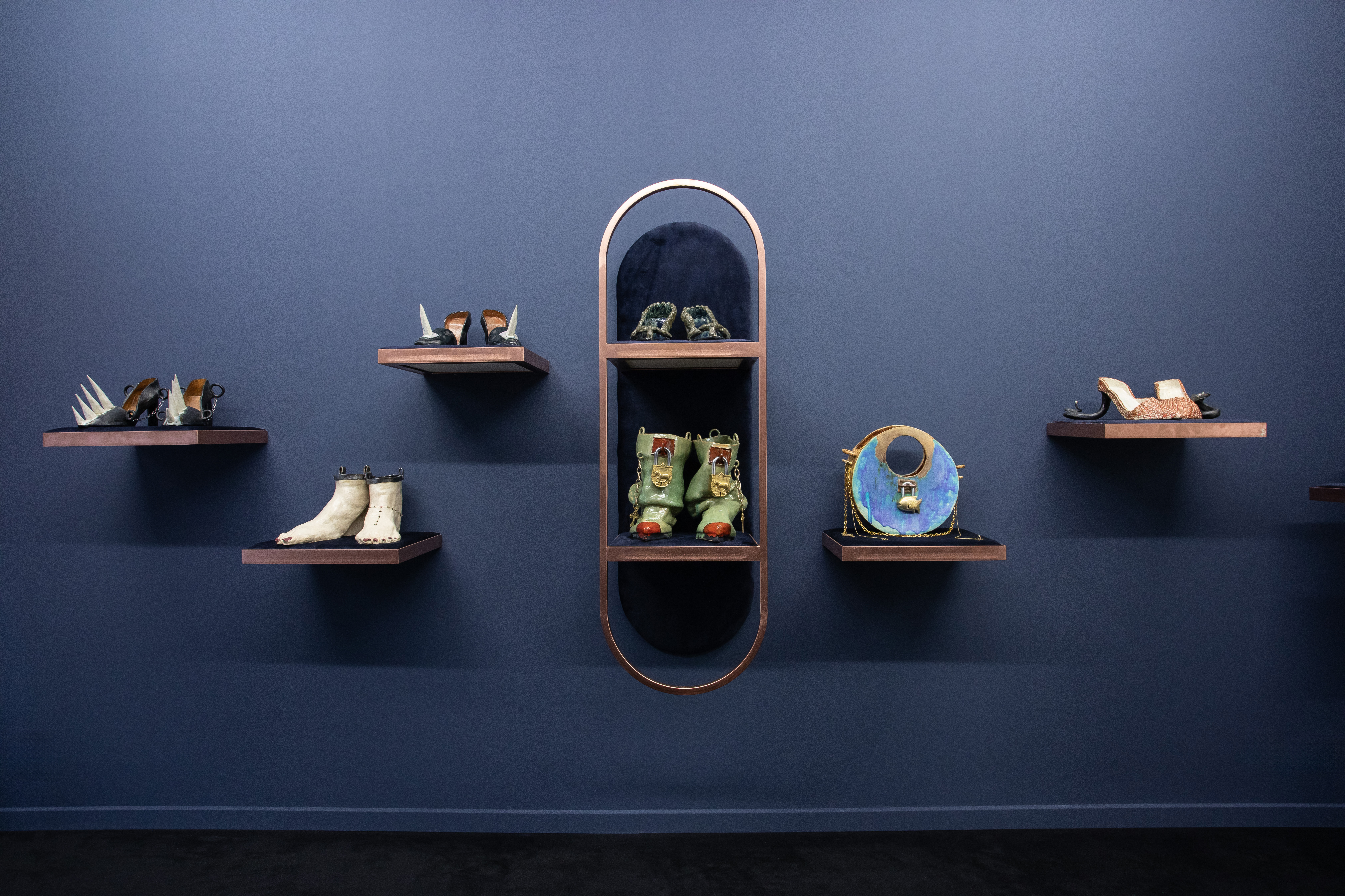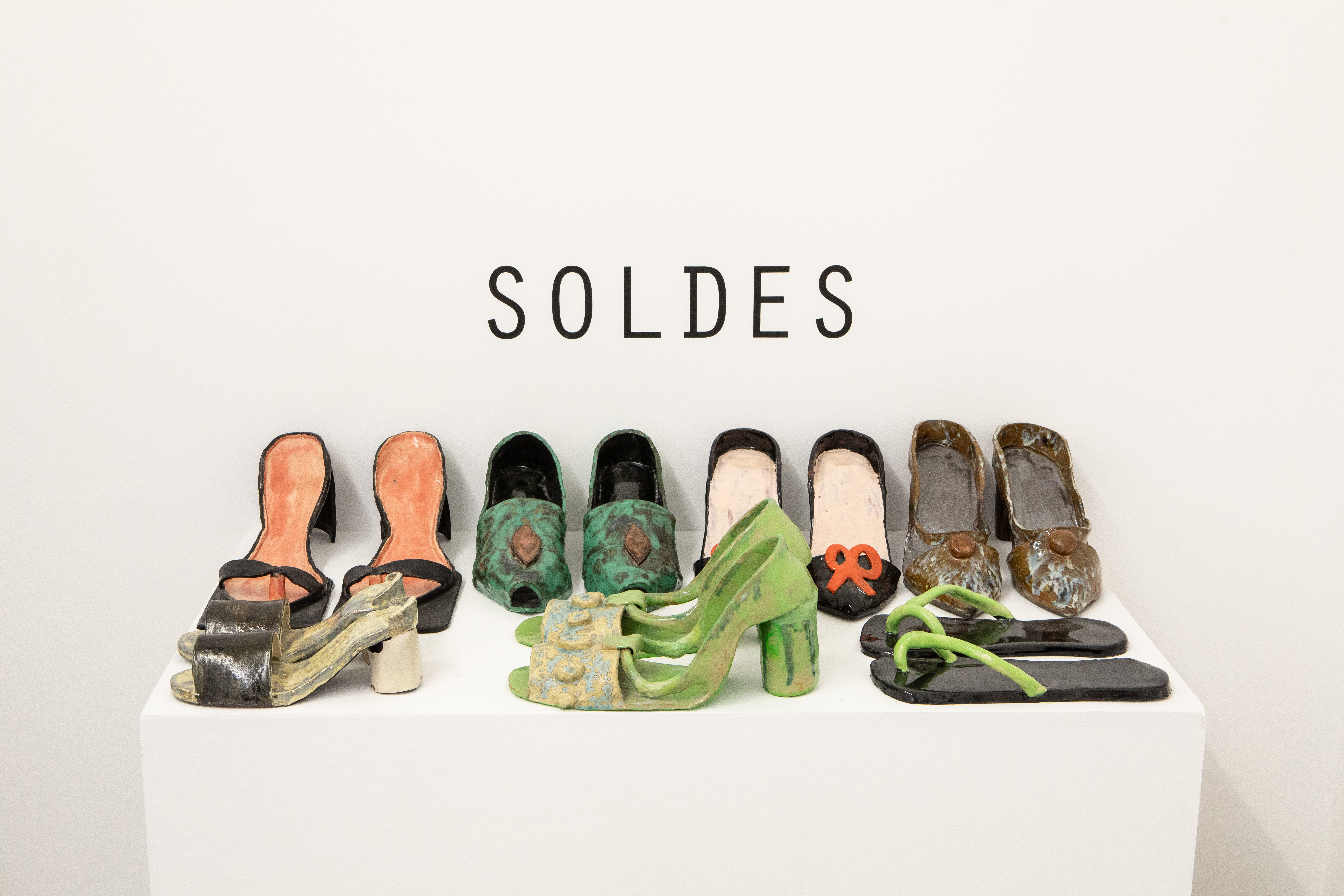 Jusqu’au 17 janvier 2026, la Galerie Alberta Pane transforme ses espaces en une véritable boutique de mode. Cette métamorphose s’opère à l’occasion de la première exposition personnelle de Marielle Chabal dans une galerie. L’artiste française présente sa marque fictive, Elle Chaval, constituée d’éléments tout aussi glamour que inconfortables : des chaussures à talons et des accessoires en céramique colorée. Cette collection automne-hiver impossible à porter renvoie aux injonctions dictant souvent la féminité, notamment la nécessité de souffrir pour être belle.
