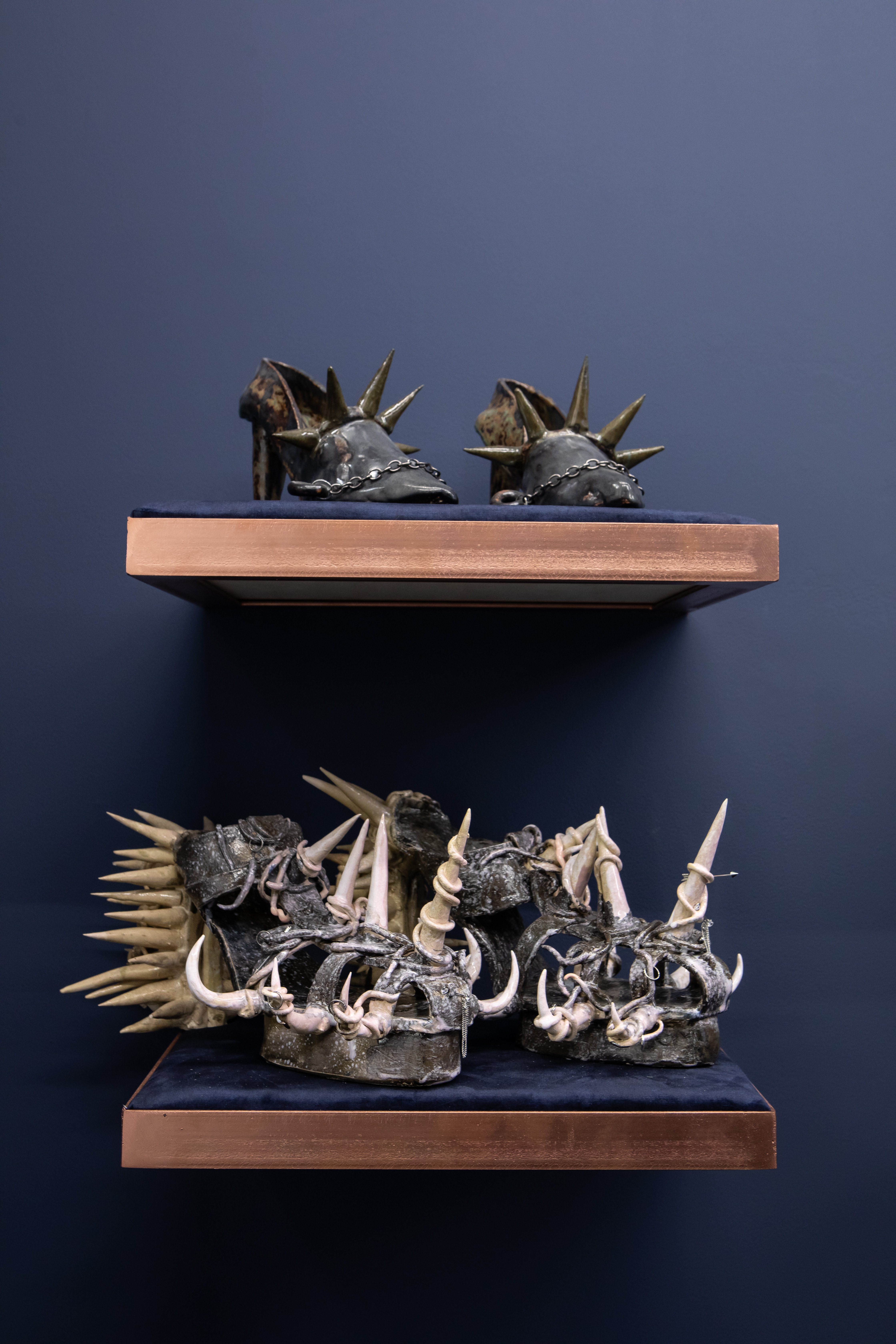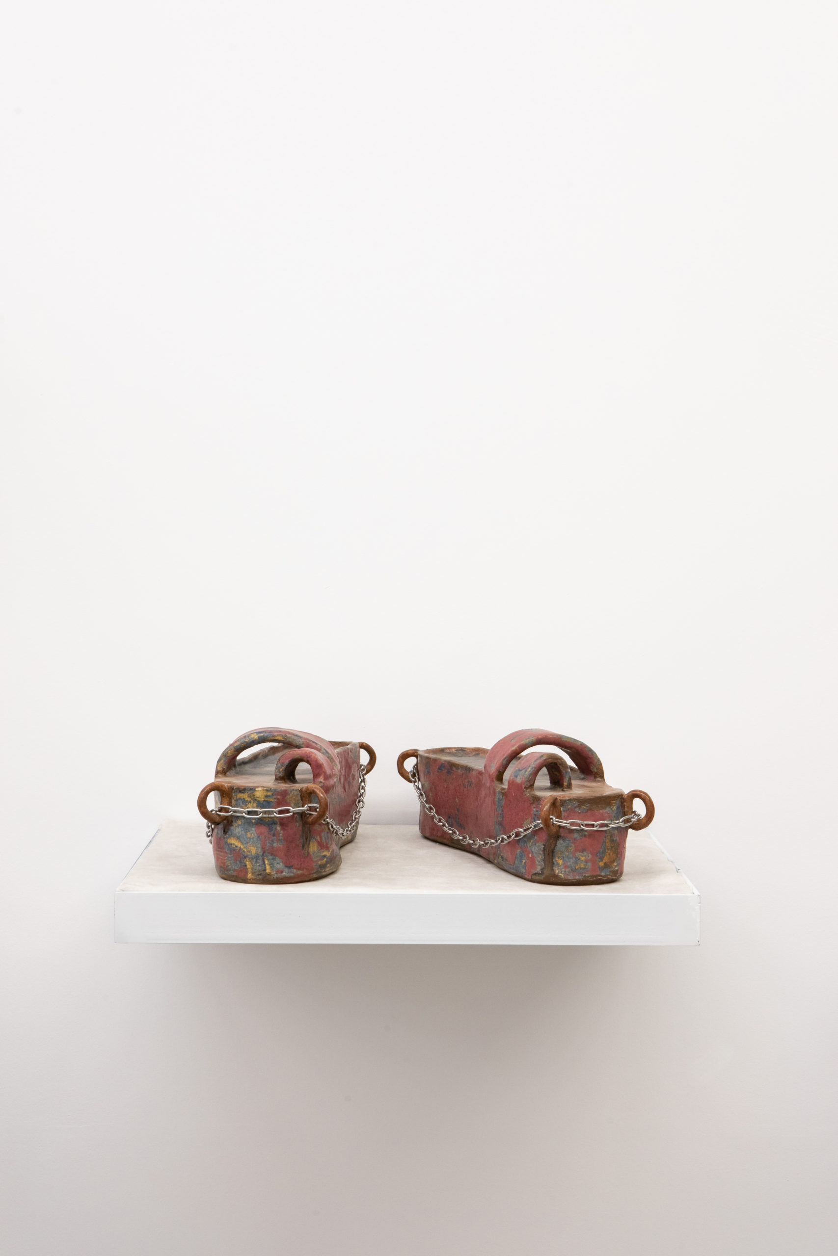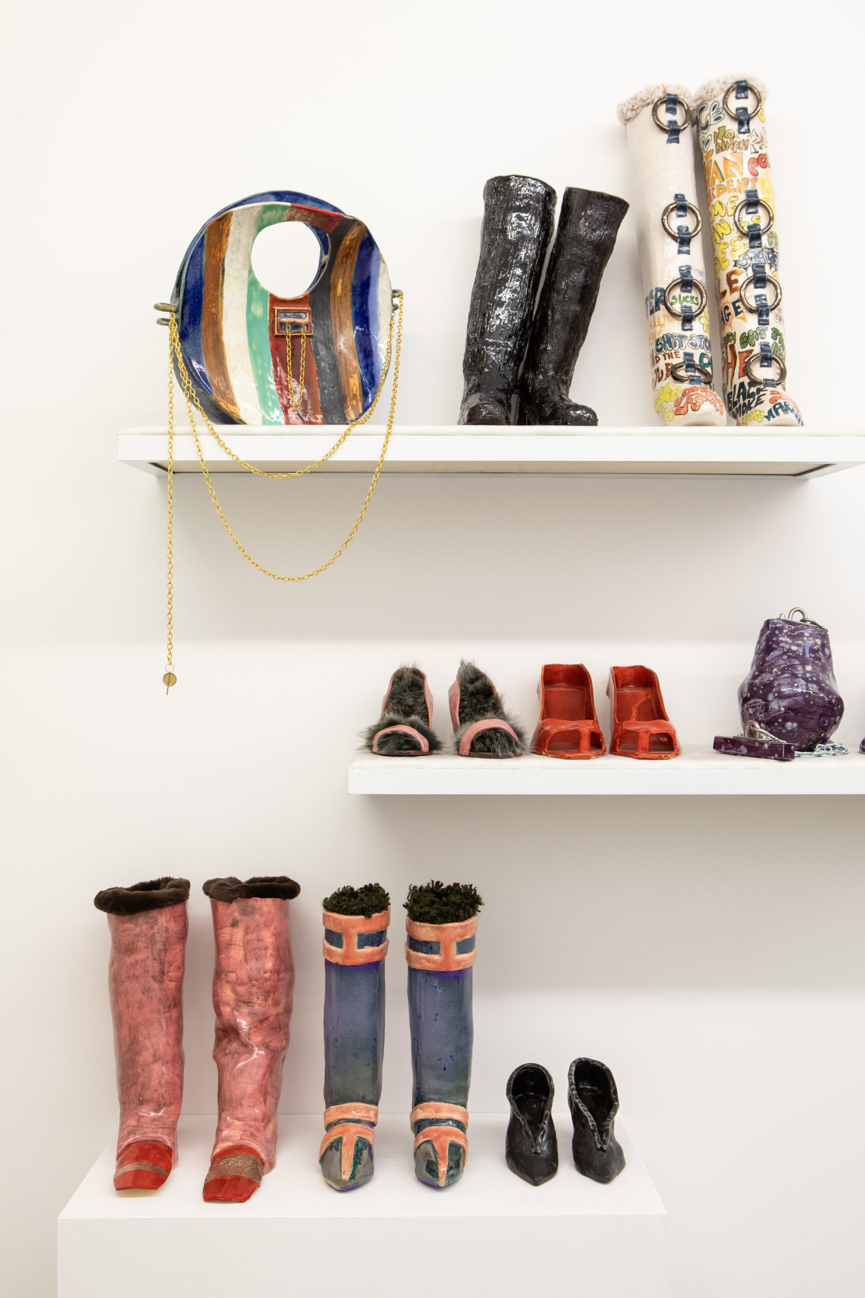 Elle Chabal propose de se plonger dans un univers ambivalent, où les designs originaux des sculptures attirent le regard et émerveillent, tout en matérialisant les travers de notre société. L’artiste s’attaque, en effet, à la construction sociale de la féminité. Il s’agit pour elle d’exposer toute la souffrance qui y est associée, conséquence de l’impact du regard patriarcal sur les identités féminines. L’écho à l’injonction “il faut souffrir pour être belle” a dirigé les choix de dimensions et de formes. La sélection de près de quarante paires de chaussures et quelques sacs et accessoires en céramique comprend un grand nombre de talons et de plateformes. Le grès laisse peu de place au rêve, il est bien sûr impossible de les porter, mais rien que leur taille peut être évocatrice de douleur et d’inconfort.