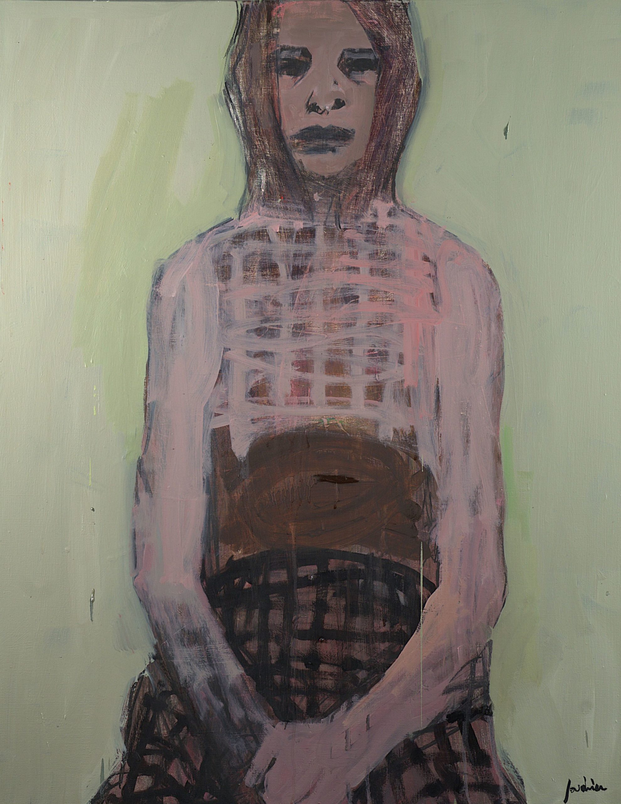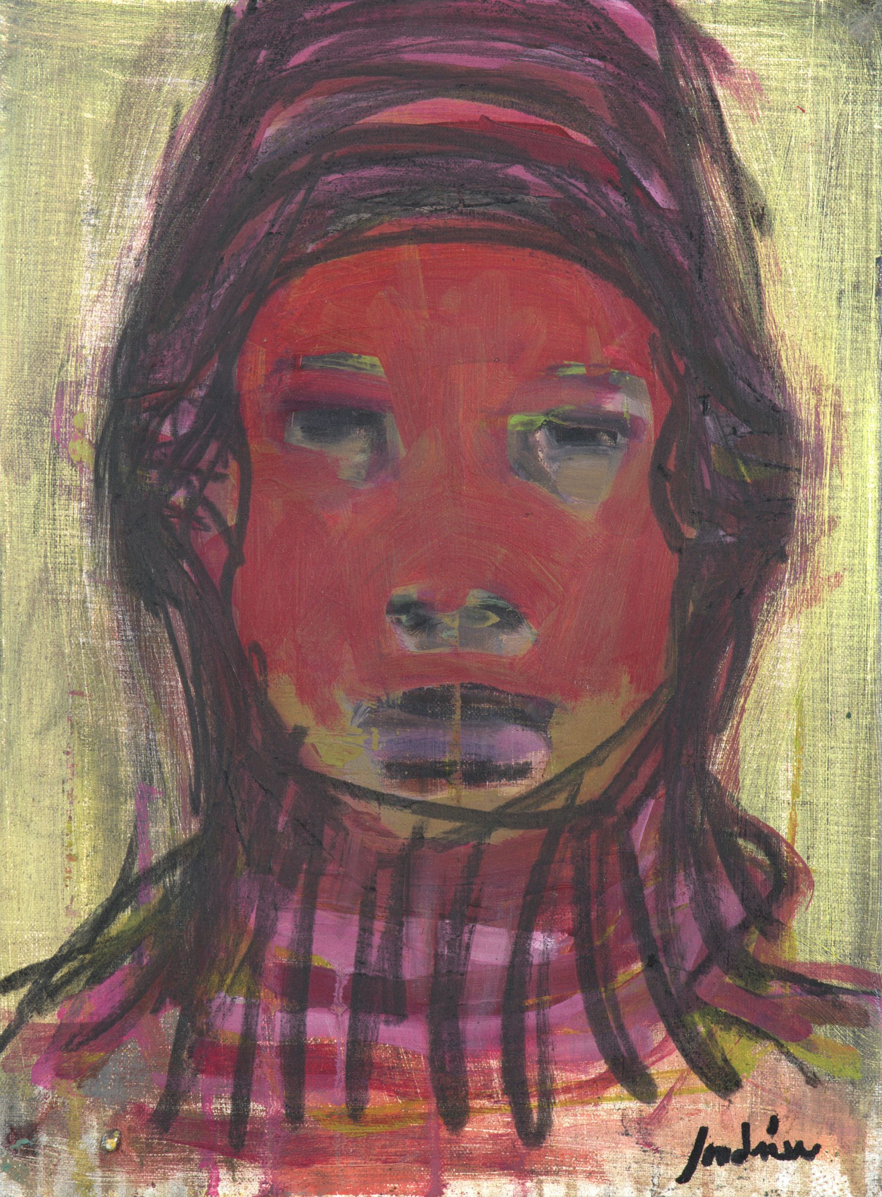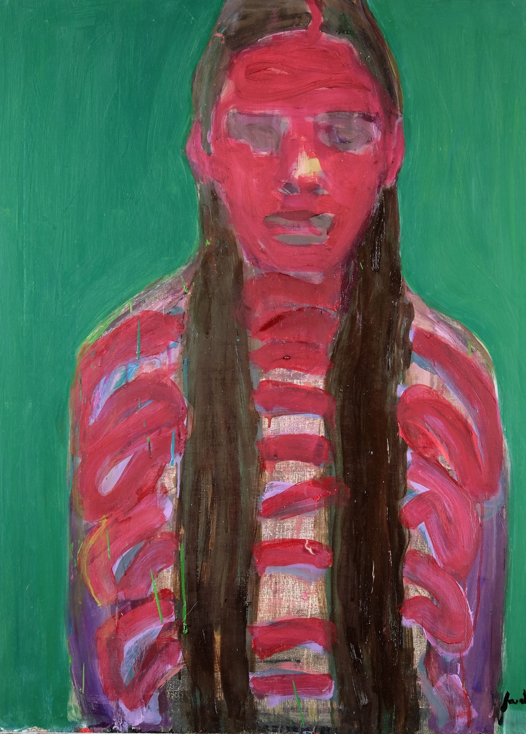 L’artiste propose aux visiteurs des peintures où l’humain est à l’honneur, sous différents formats. Des portraits ou plutôt des « faces » où leurs regards semblent se perdre et vouloir fuir. Les visages sont encadrés par des traits épais ce qui intensifie leur expression et invite le spectateur à d’autant plus les scruter.