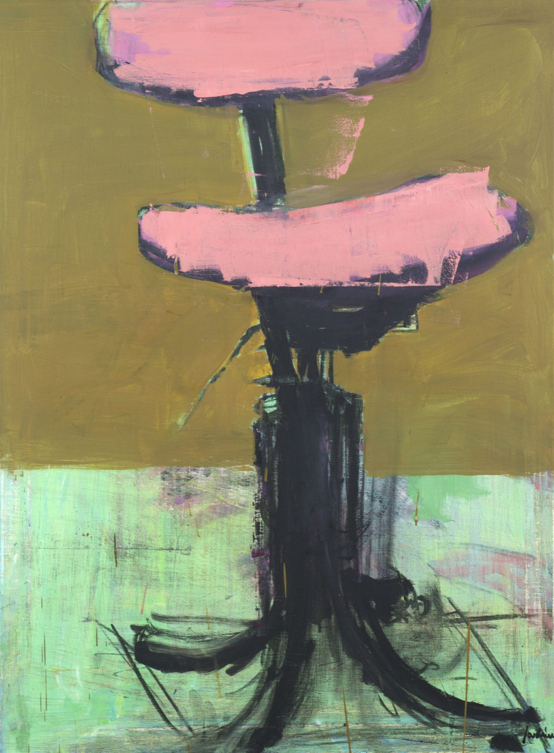Mais l’artiste est aussi connu pour ses fauteuils, vides. Les « fauteuils » sont présentés sans humain, ils sont laissés seuls mais on ressent toute la profondeur de ceux-ci. Grâce rose vif et aux traits qui s’échappent des pieds Françoise Joudrier réussit à faire ressentir le mouvement de la chaise à roulettes, et ce malgré une touche épaisse qui enracine le sujet à la matière.