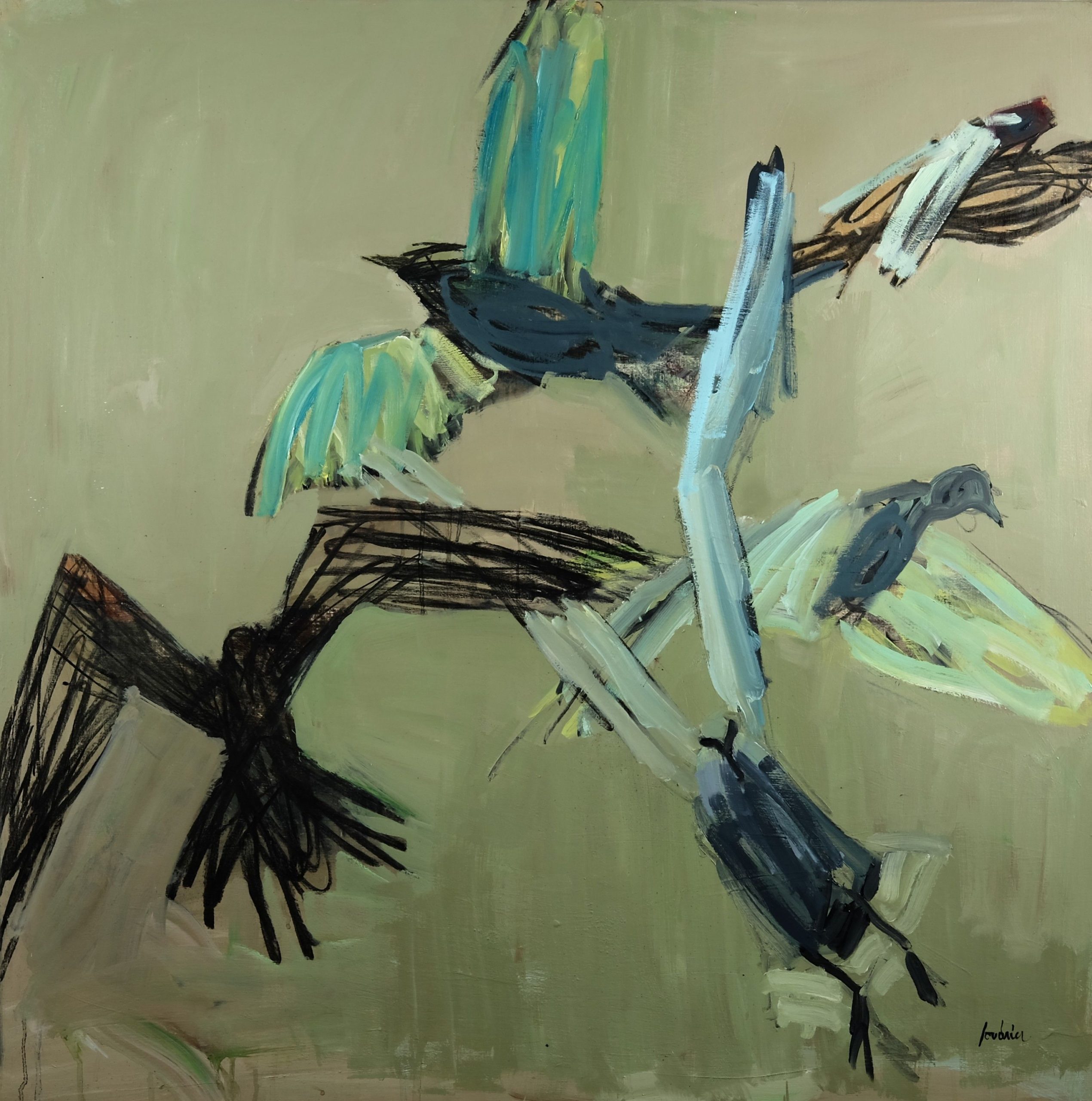 Ce que l’on remarque cette année, c’est la présentation d’une série de tableaux nommée Oiseaux. L’artiste dépeint des nuées d’oiseaux en plein vol, ce qui donne du dynamisme à l’ensemble des œuvres exposées. Face au statisme des fauteuils et des portraits, ces œuvres aux fonds bleu ou bien orangé donnent une force et une vitalité aux oiseaux. Les oiseaux se déplacent dans tous les sens et emplissent la toile dans une forme de désordre organisé.