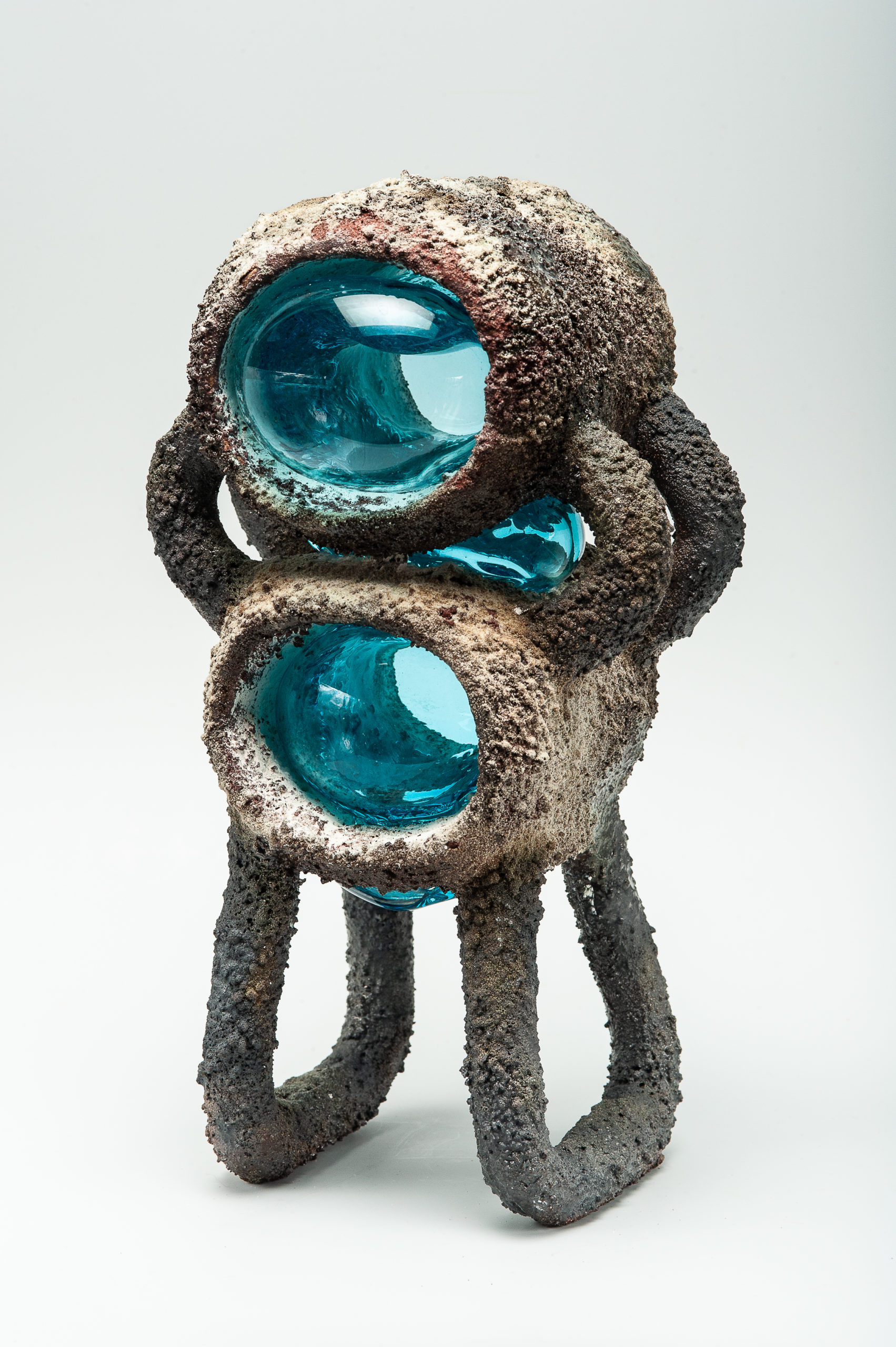 Arnauld Le Calvé (né en 1977) se décrit comme un sculpteur à la pratique libre et instinctive. Il travaille principalement le verre et la céramique, faisant de lui un véritable maître des arts du feu. Il a acquis ses compétences de verrier dans les ateliers en compagnonnage, avant de rejoindre le Centre International de Recherche sur le Verre et les Arts plastiques à Marseille en tant qu’assistant. Trois ans après l’ouverture de son propre atelier de souffleur de verre en 2011, Arnauld Le Calvé commence une formation de céramiste en autodidacte. L’association et la maîtrise de ces techniques lui ont permis de développer une sculpture unique, fondée sur le contraste des textures lisses et rugueuses de ses matériaux de prédilection.