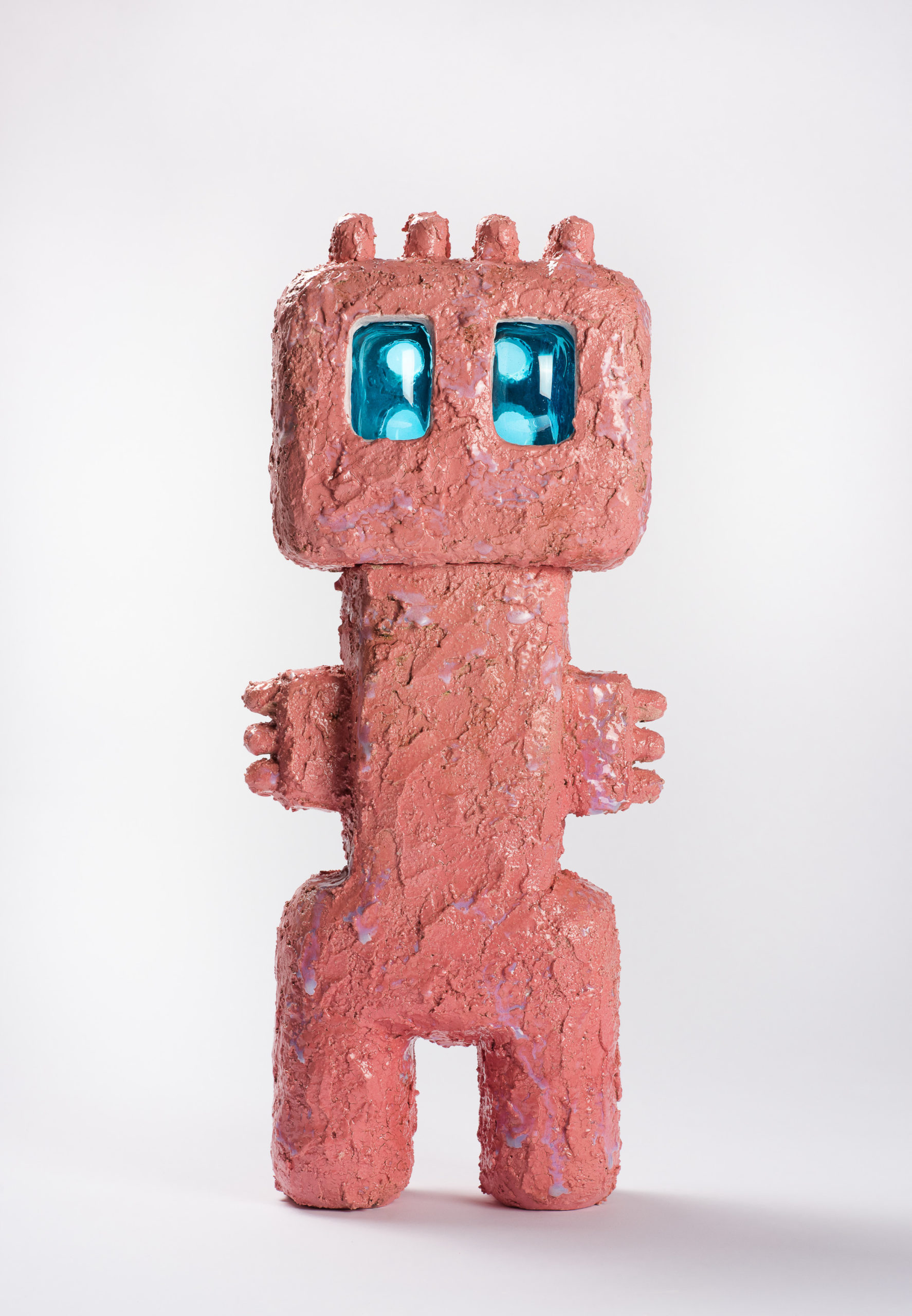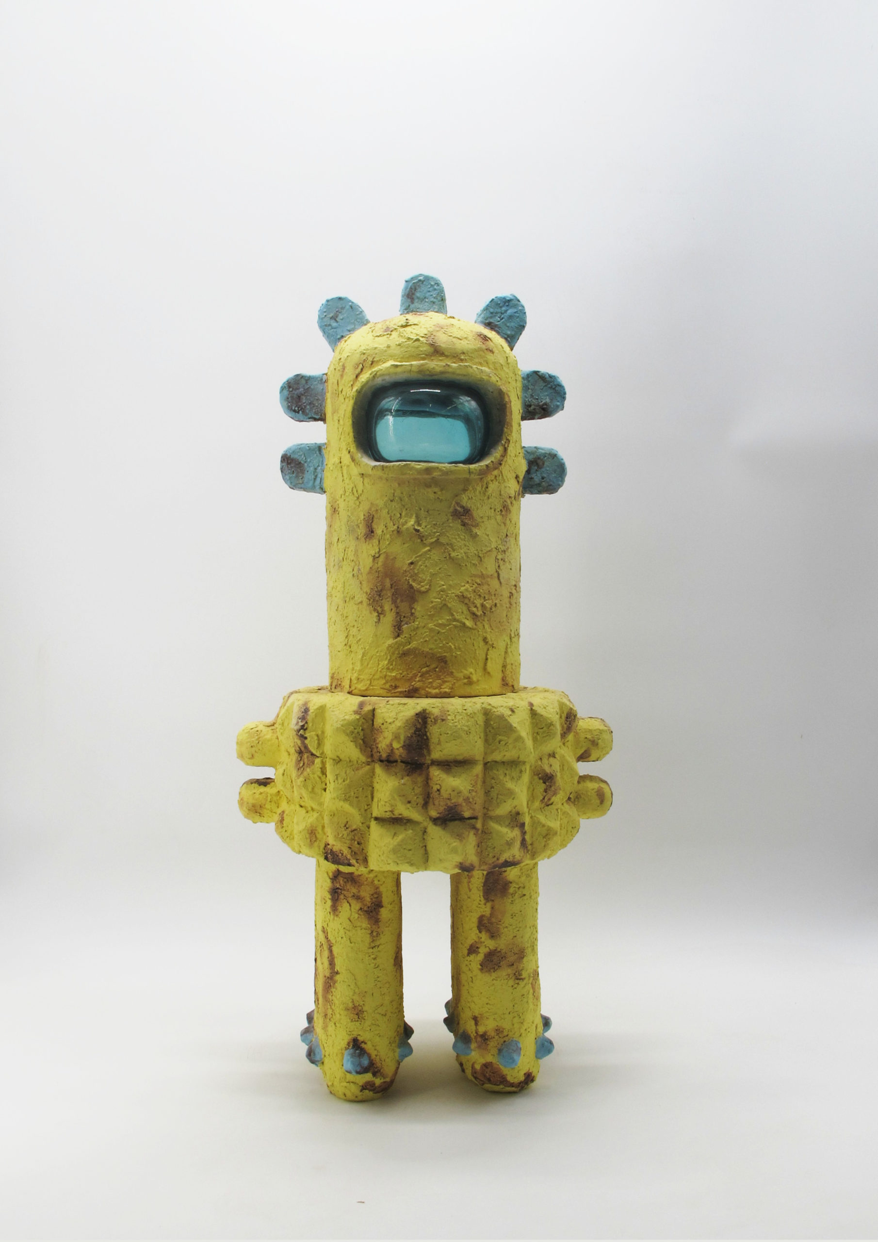 L’exposition Hurluberlus, fruit de la collaboration entre les galeries Vazieux et  Agnès Thiébault, met à l’honneur l’univers que l’artiste a construit autour de ses nombreuses inspirations. Les influences à l’origine de son langage personnel incluent l’architecture, notamment les constructions de Pascal Haüsermann (1936-2011), la nature, ainsi que les croyances animistes et le vaudou de l’ancien Dahomey. Les sculptures qui en résultent sont des figures anthropomorphes aux apparences archaïques et futuristes. La surface granuleuse de ces gardiens en grès chamotté évoque la roche volcanique ou une matière dégradée par les effets du temps. Ce qui vient les relier au domaine de la science-fiction, ce sont leurs couleurs vives et la brillance de leurs parties en verre. Alors que ces créatures s’éloignent du totem traditionnel de par leur contemporanéité, elles dégagent une une poésie vibrante empreinte de mystère et de vitalité.