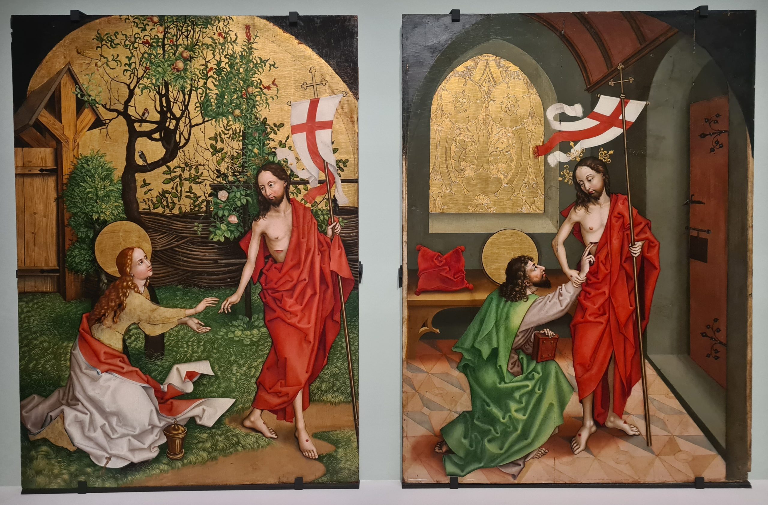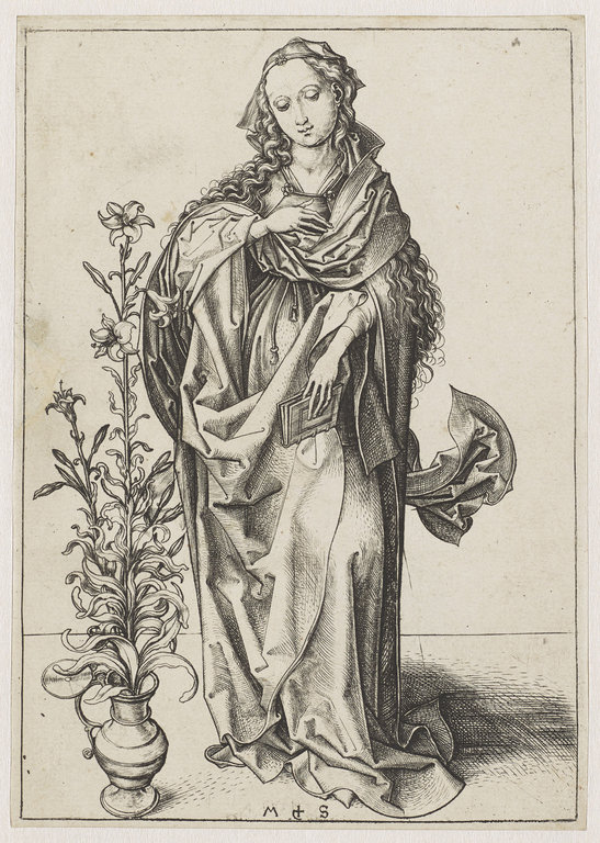 Le parcours s’organise en deux grandes sections. La première est consacrée à la vie et à l’œuvre de l’artiste, réunissant un ensemble exceptionnel de gravures, de dessins et, fait rare, la quasi-totalité de ses peintures connues. Parmi elles figure la Vierge au buisson de roses de 1473, unique œuvre datée de sa main, qui témoigne de son sens de la composition et de son attention à la nature. L’exposition réussit à souligner la polyvalence de Schongauer, capable de passer d’un support à l’autre.