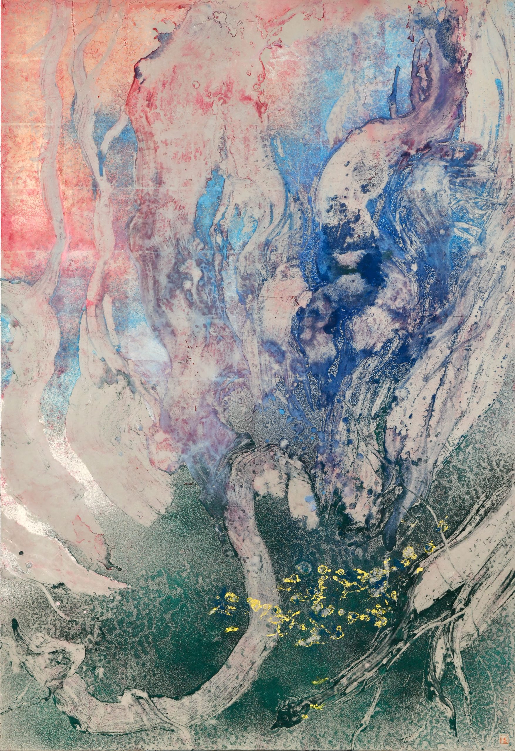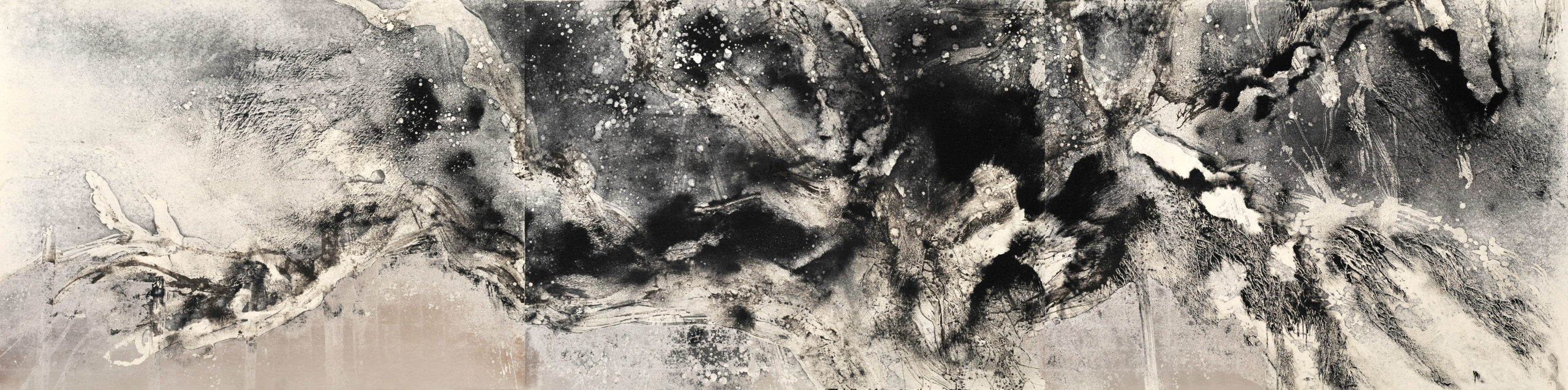La galerie et les proches de l’artiste cherchent à prolonger la vision et à diffuser l’œuvre singulière d’un créateur inscrit dans une riche tradition artistique japonaise. Takehiko Sugawara maîtrise, en effet, les techniques ancestrales du Nihonga, impliquant l’utilisation de matériaux naturels tels que les pigments minéraux et le papier washi. Ceux-ci représentent les composants les plus récurrents de l’ensemble de sa production, parmi elle, les quarante tableaux exposés. La mobilisation d’un tel savoir-faire ne se fait pas sans innovation car Takehiko Sugawara les revisite pour proposer des formes et des textures uniques. Par exemple, il transforme des mélanges d’encre de Chine, de cendres de pin et de colle nikawa (colle à base animale) en pâte dense et visqueuse, déviant de son usage classique.